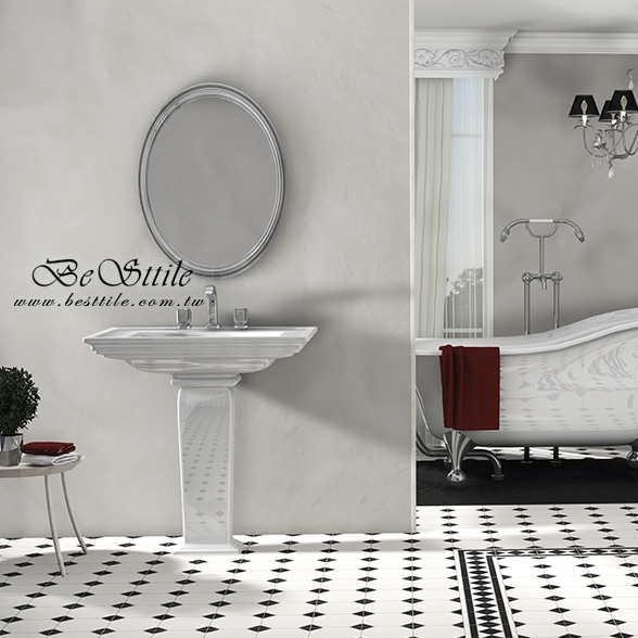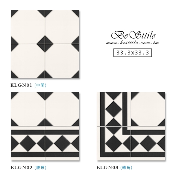 ELGN01 - 黑白花磚 (中間) ELGN02 - 黑白花磚 (腰帶) ELGN03 - 黑白花磚 (轉角) ▲手工花磚、精緻花磚、典雅花磚,水泥花磚、拼圖花磚、玄關花磚、地毯花磚、幾何花磚,立體花磚、歐式古典花磚、西班牙鄉村花園。