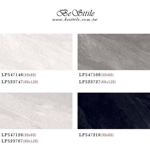 【30x60】 LPS47146 - 晨光白 LPS47126 - 雲霧灰 LPS47166 - 峭壁灰 LPS47216 - 穆勒黑 【60x120】 LPS23747 - 晨光白 LPS23767 - 雲霧灰 LPS23727 - 峭壁灰 ▲電視牆、主牆、浴室廁所、戶外地板、牆壁、公共空間、客廳、臥房、餐廳、廚房、衛浴、戶外牆、大理石、花崗石、板岩