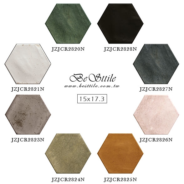 JZJCR2821N - 星光白 JZJCR2826N - 玫瑰粉 JZJCR2823N - 奶茶棕 JZJCR2827N - 深海藍 JZJCR2824N - 抹茶綠 JZJCR2828N - 琴鍵黑 JZJCR2825N - 陽光橘 JZJCR2820N - 叢林綠 ▲六角磚,幾何、六角、蜂巢,現代風、工業風,咖啡廳、特殊造型磚、花磚