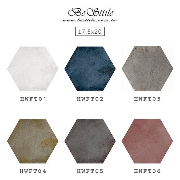 HWFT01 - 雲霧白 HWFT02 - 藏青藍 HWFT03 - 海霧灰 HWFT04 - 松柏綠 HWFT05 - 青空灰 HWFT06 - 石榴紅 ▲六角磚,幾何、六角、蜂巢,現代風、工業風,咖啡廳、特殊造型磚、花磚