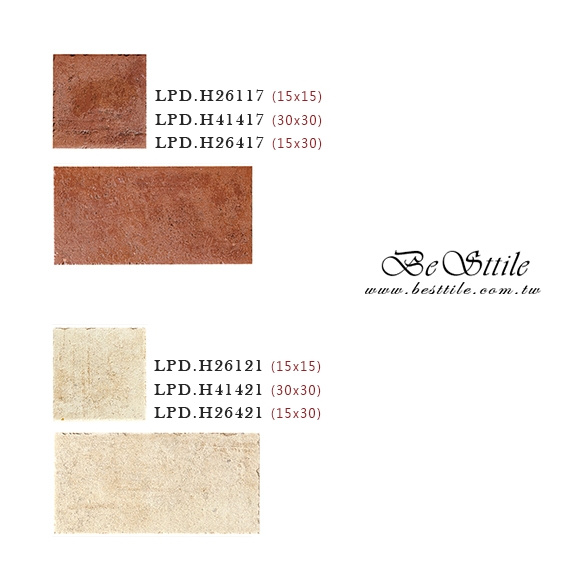 LPDH41421 - 月光白 LPDH26421 - 月光白 LPDH26121 - 月光白 LPDH41417 - 鐵鏽紅 LPDH26417 - 鐵鏽紅 LPDH26117 - 鐵鏽紅 LPDH26121F5 - 月光白(花磚) LPDH26117F5 - 鐵鏽紅(花磚) LPDH4141MC - 田園馬賽克
